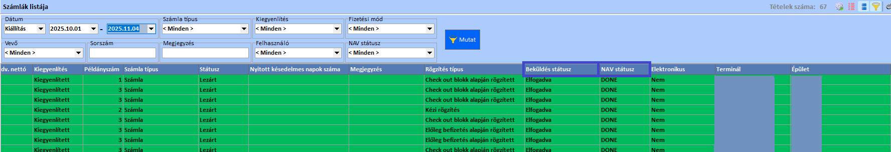 Beküldés - és NAV státusz képe a számlák ablakán.